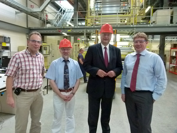Bei der Firma epurex films nahmen Head of Product Supply Dr. Dirk Schultze (li.) und Managing Director Peter Barwitzki (re.) Grindel und Jahnke in Empfang |